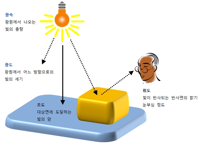 3) 휘도: 사람 눈으로 들어오는 빛의 세기, 단위는 lm/m2/sr