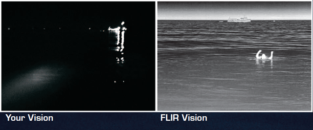 아래 사진과 같이 사람이 인지하는 가시광대역(약 0.4um-0.8um)에서는 볼 수 없는 장면이 원적외선 대역의 카메라로 밤 바다에 빠진 사람을 인지하여 구조할 수 있습니다.