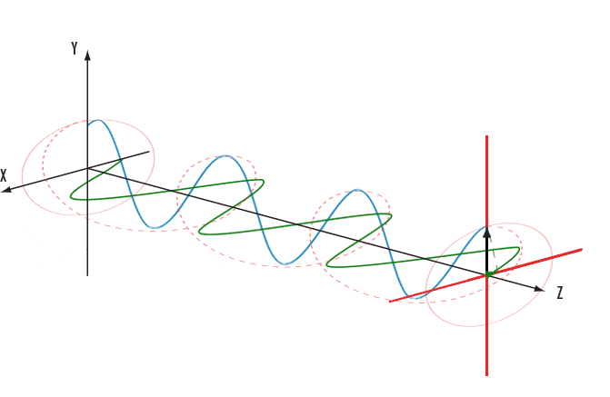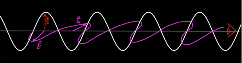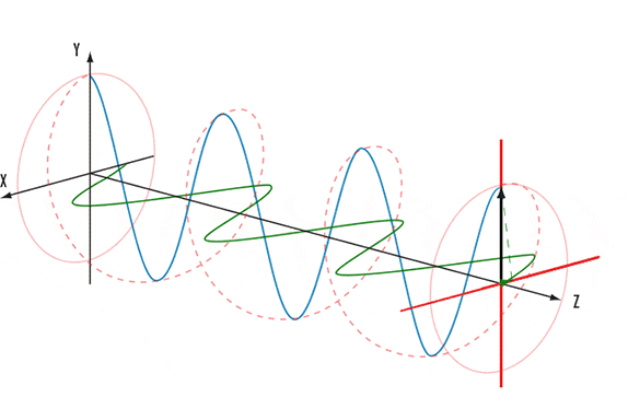 두 전기장의 phase가 PI/2일때 두 전기장의 합은 두 벡터의 합에 의해 진행 방향에 따라 진동하는 방향이 원형으로 회전합니다. 위상이 PI/2가 아니면 타원형 편광이 발생합니다.