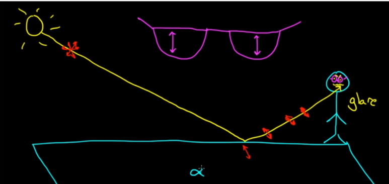 편광처리된 선글라스는 태양에서 나온 빛이 일부는 반사되고 일부는 투과되는 특성을 이용합니다. 여기서 반사되는 성분만을 제거하여 눈부심을 해결하는 역할을 합니다.