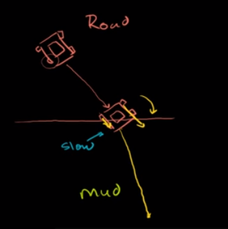 빛이 서로 다른 매질의 경계면에서 비스듬히 입사할 때 먼저 입사하는 부분은 빛의 속도가 느려져 아직 입사하지 않은 부분에 비해 같은 시간 대비 진행 거리가 짧겠죠. 따라서 특정 각도로 굴절되는 것입니다. 앞선 반사/굴절 포스팅에서 자세한 설명을 확인할 수 있습니다.)